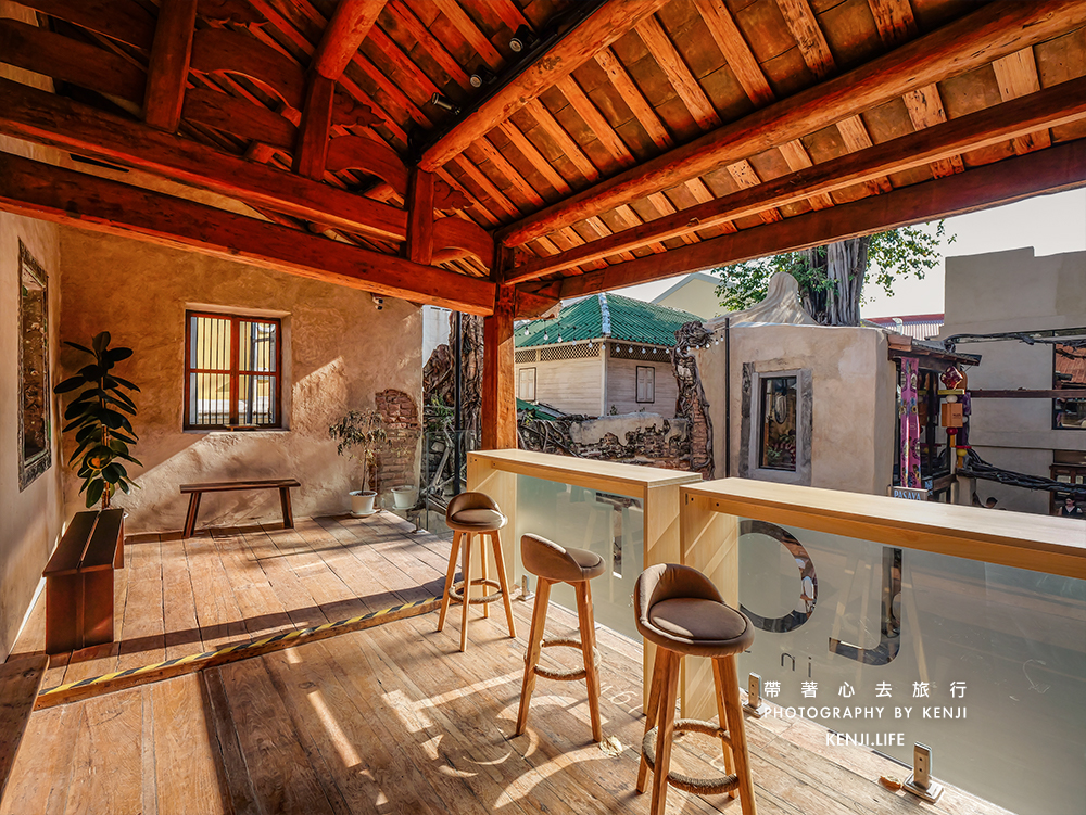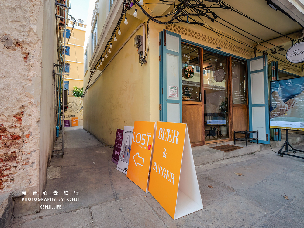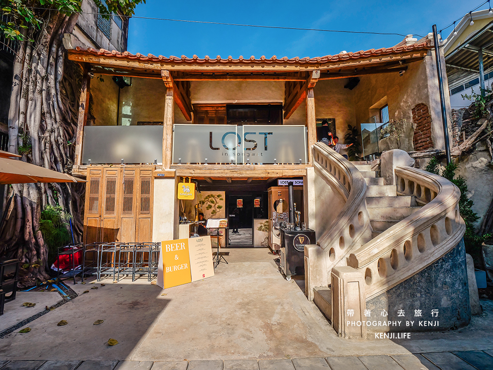 ▲這一棟兩層建築真的有夠特別,日式、中式還帶點泰式氛圍,這就是泰國老城區最流行的風格之一,一樓是Beer & Burger,二樓就是我這次要去的Lost in Songwat,是一間咖啡店,也有賣少許甜點品項。從右手邊的樓梯走上去即可,是說,這個樓梯真的很好拍照,風格也特別。
