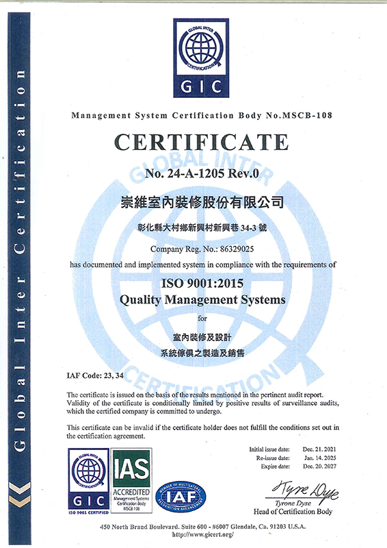 ISO是一套國際通用的品質管理系統,在室內裝修展業來說,它的價值就是把施工流程制度化,把驗收的步驟都標準化,透過ISO的認證制度,更能確保在施工的整個流程一直到完工都能夠被驗證。也因為ISO的認證,更能讓客戶得到最好的品質,這就是崇維系統傢俱能夠一直維持初心,並受到許多客戶肯定的原因之一。