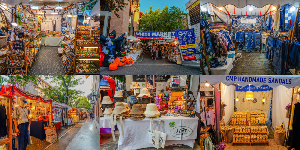 來逛清邁尼曼一號,不要錯過旁邊還有一個清邁白色市集 White Market,此市集每天下午3點開始營業,這裡集結了各種清邁當地特色的手工藝品、民族風格服飾、各種包款攤位、天然香氛、飾品配件、小品牌商品攤位、露天咖啡廳都有,整條路不長,攤位很集中,還蠻好逛,而且很多攤位店家都好親切,