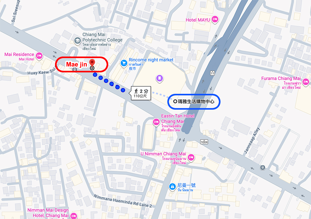 ▲清邁「金媽媽泰式料理 Mae jin」餐廳的店址距離熱鬧的MAYA 瑪雅生活購物中心超近,步行約2分鐘即可到達,這一區屬於尼曼區,如果你不是住在尼曼區,交通部分可以利用Grab或Bolt App來叫車,或是包車、租機車、坐公車、嘟嘟車。我個人最常使用的是Bolt來叫車,叫車速度快,價格也比較優惠,車種也選擇多,來清邁自由行,很推薦你們可以試看看。