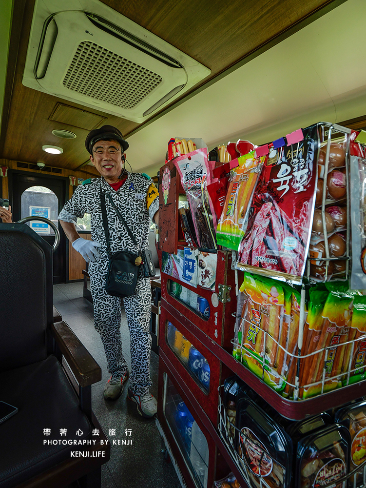 ▲搭此蒸汽火車還有個特色,就是會有一位逗趣的大叔推著餐車販售各種零食、飲料,本人很幽默,還會與乘客互動,很好玩。這是我第二次見到他,依舊風趣好玩,車上可以喝飲料吃東西,有來搭蒸汽火車遇到他,可以跟他買個飲料拍照囉^^。